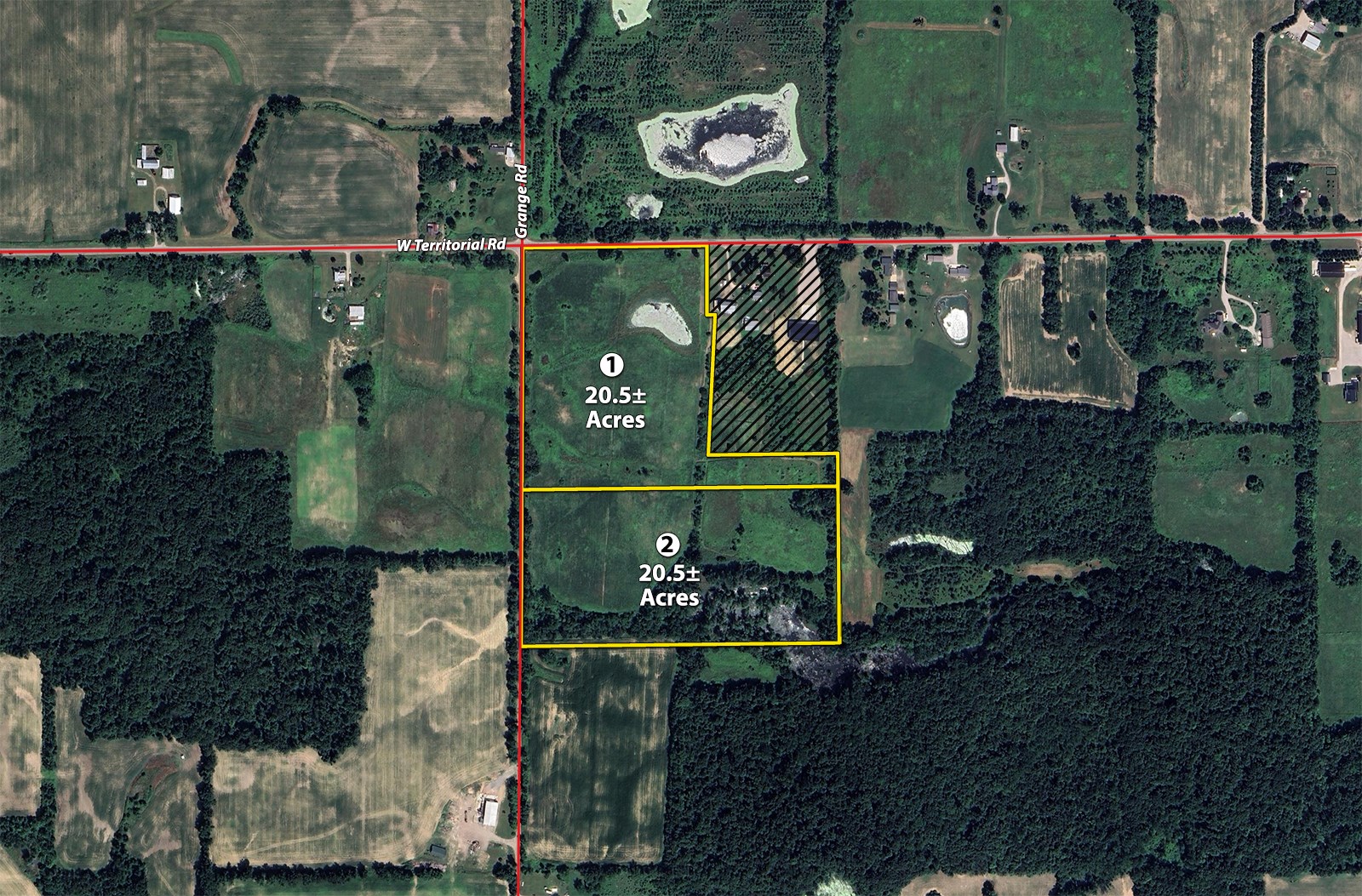 Tract 1: 20.5± ac with rolling topography with trees and open land with a nice farm pond. Frontage on Territorial and Grange Roads.
