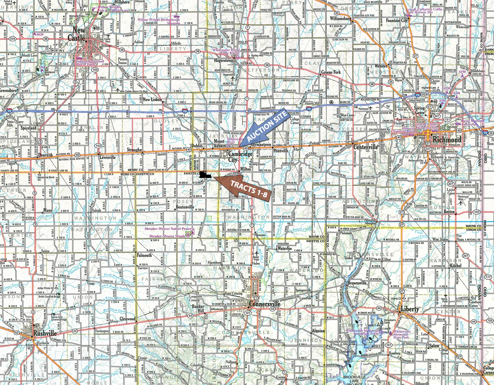 From Cambridge City: Travel West on US 40 1.5 miles to Dublin, turn South on Foundry Road and continue 2 miles to the farm. The farm has frontage on N. CR 350 West (Foundry Rd.) and W CR 1000 N (Wagner Rd.).