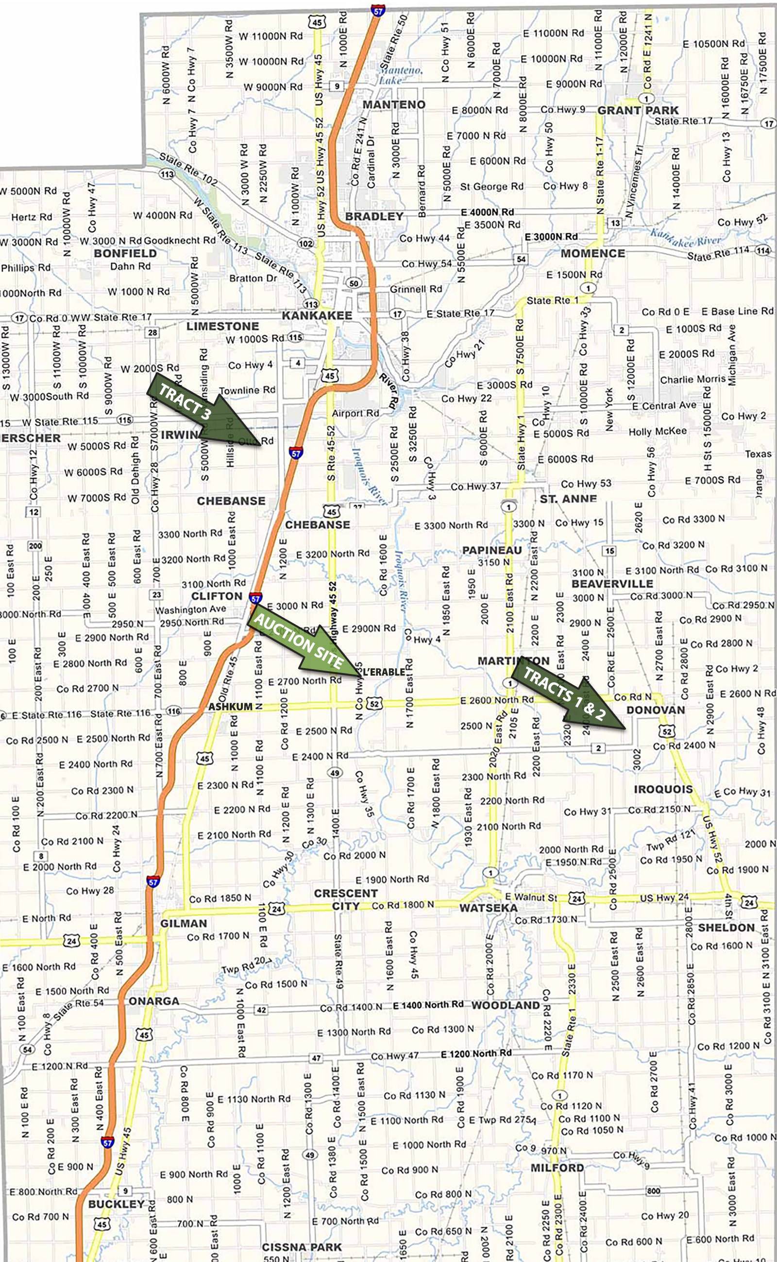 173+/- acres offered in 3 tracts ranging from 33+/- to 100+/- acres in Iroquois and Kankakee Counties, Illinois.