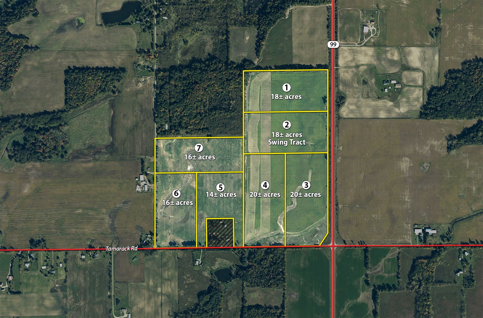 Tract 4: 20± ac mostly tillable w/frontage on Tamarack Rd. Consider combining with Tracts 2 and 3.