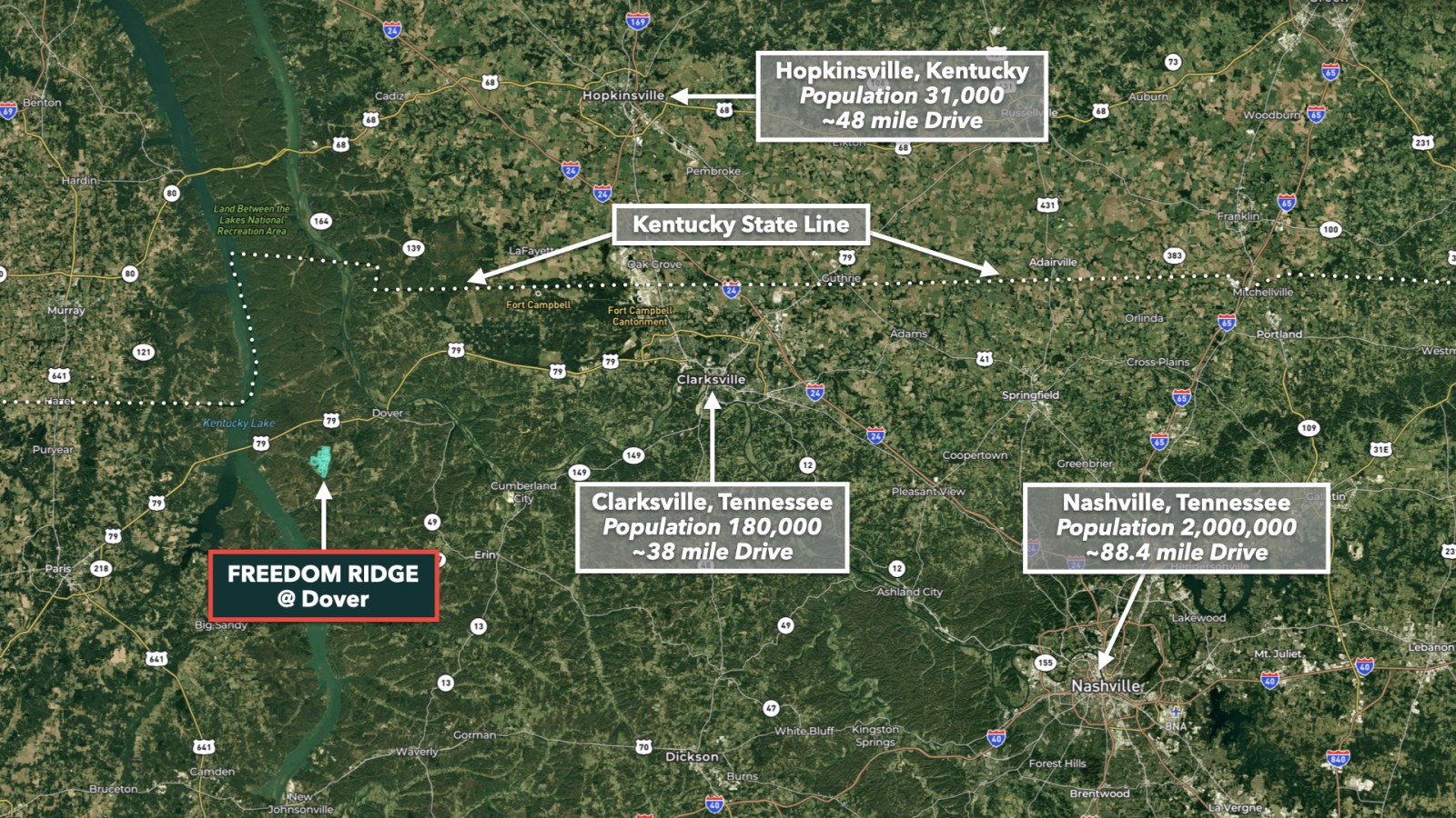 Freedom Ridge Dover is ideally situated between Kentucky Lake and Lake Barkley, while also being less than 3 miles from the South boundary of the 170,000 Acre Land Between the Lakes National Recreation Area.