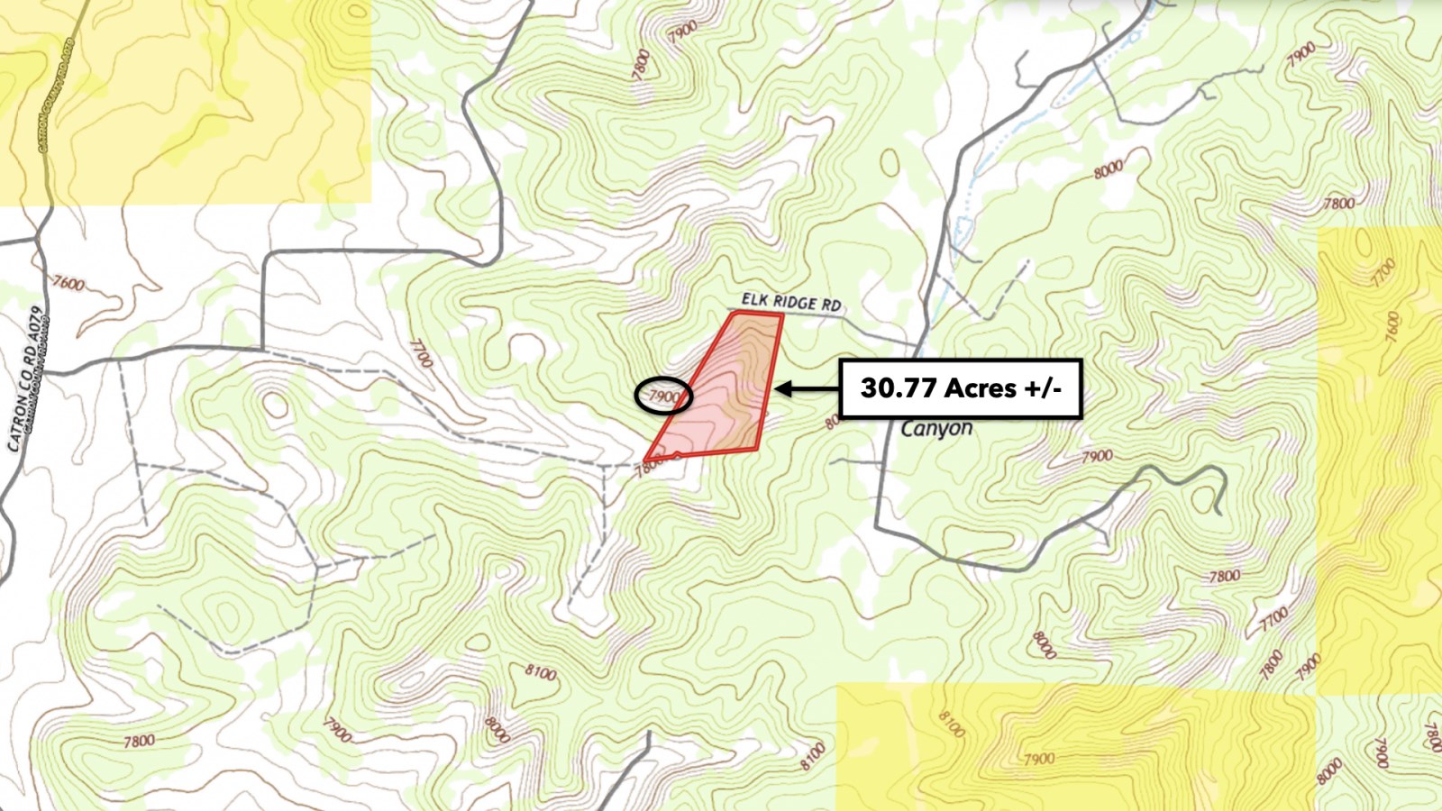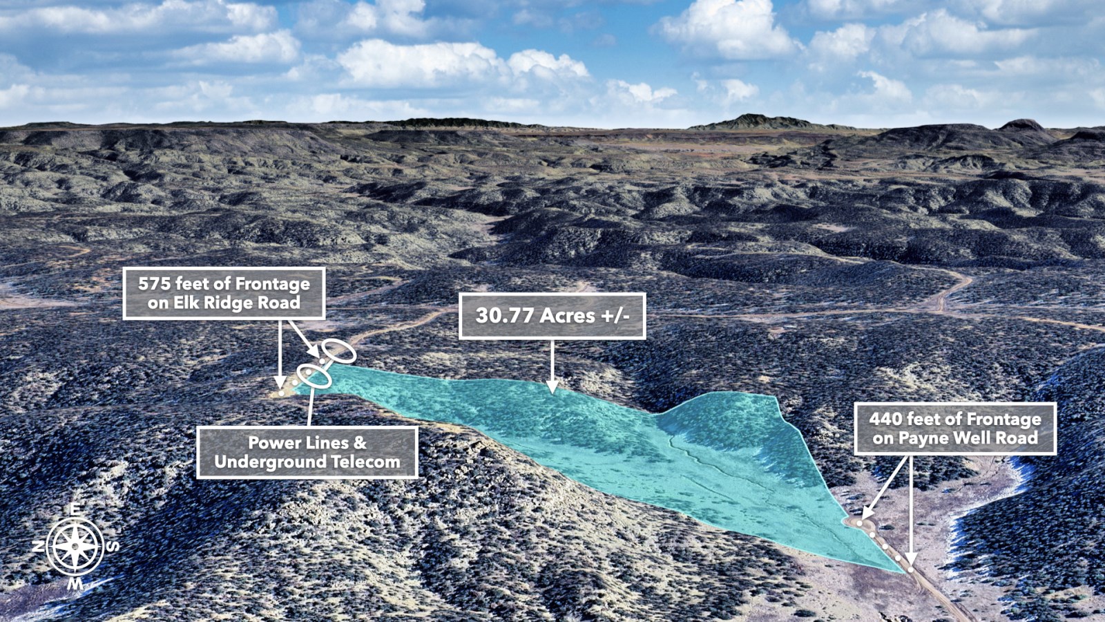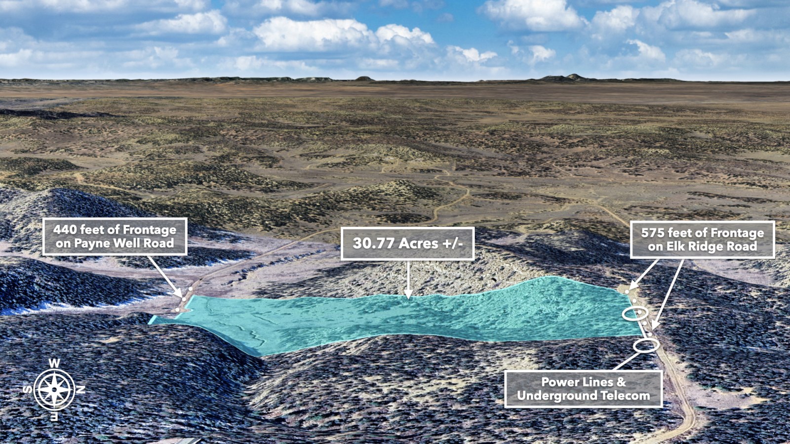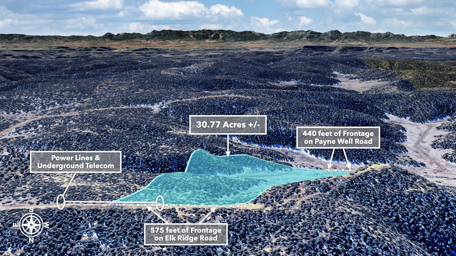 • 575 feet of frontage along Elk Ridge Road on the northern boundary, where power lines are already in place
