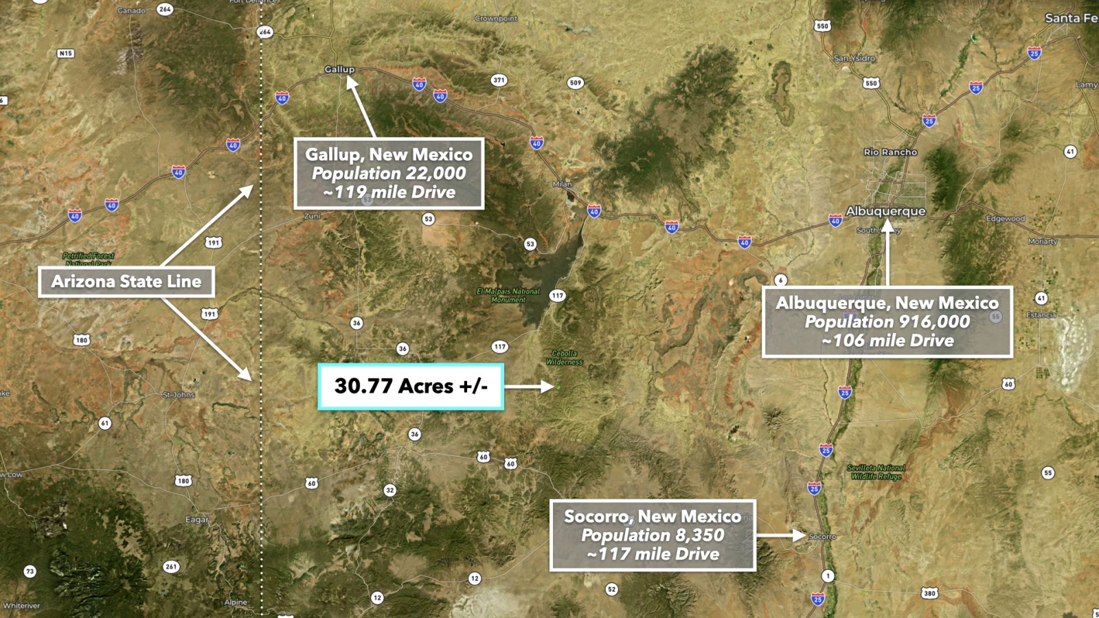 • Nearest major route is NM State Highway 117, approximately 15.6 miles via the south route or 18.9 miles via the north route.