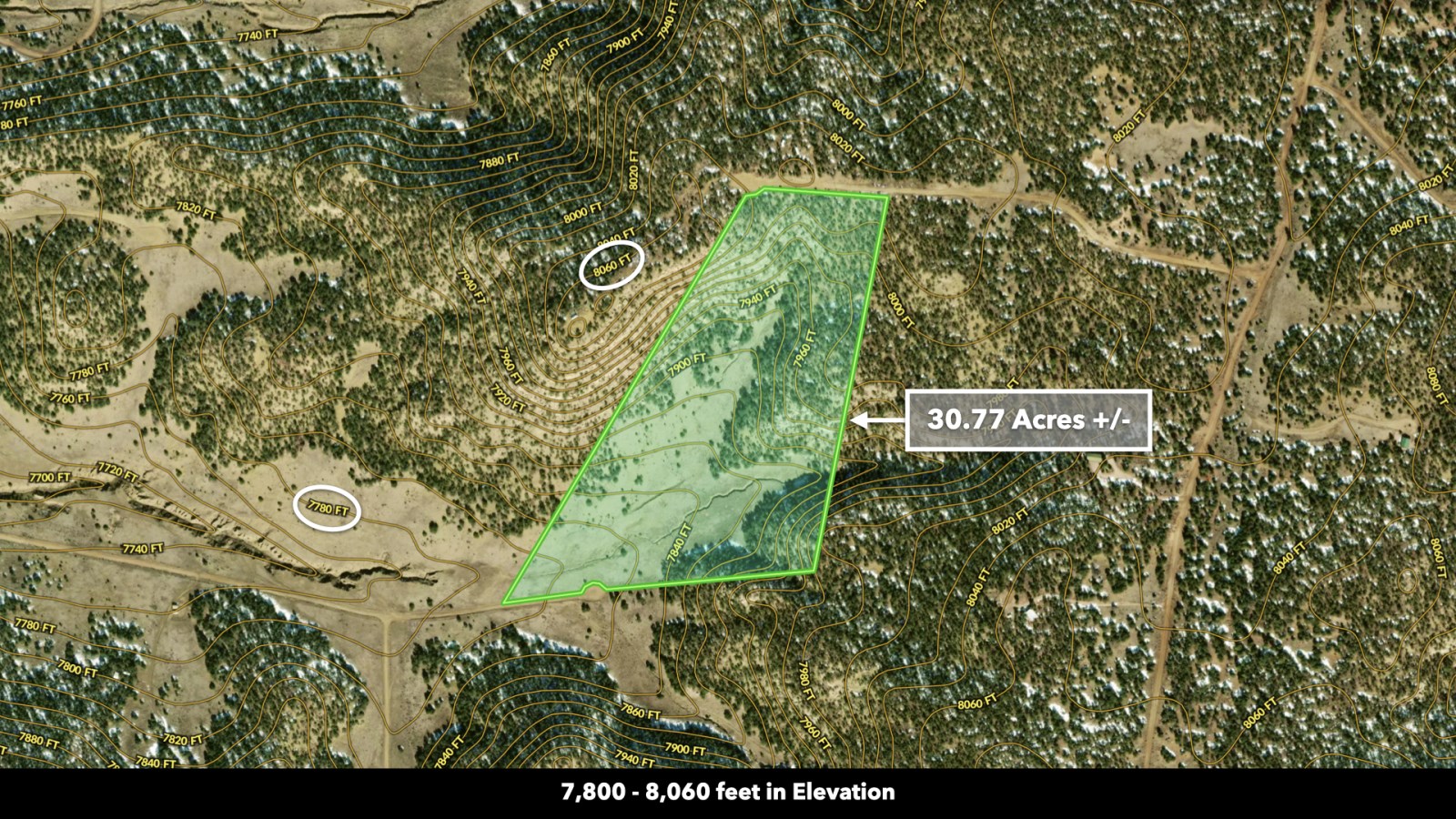This parcel spans 30.77 Acres with a gently varying elevation from approximately 7,800 to 8,060 feet, giving you cooler summers, expansive views, and a true mountain feel. The land is partially treed and partially open, making it ideal for a homesite, cabin, or recreational basecamp with natural wind breaks and shaded areas already in place.
