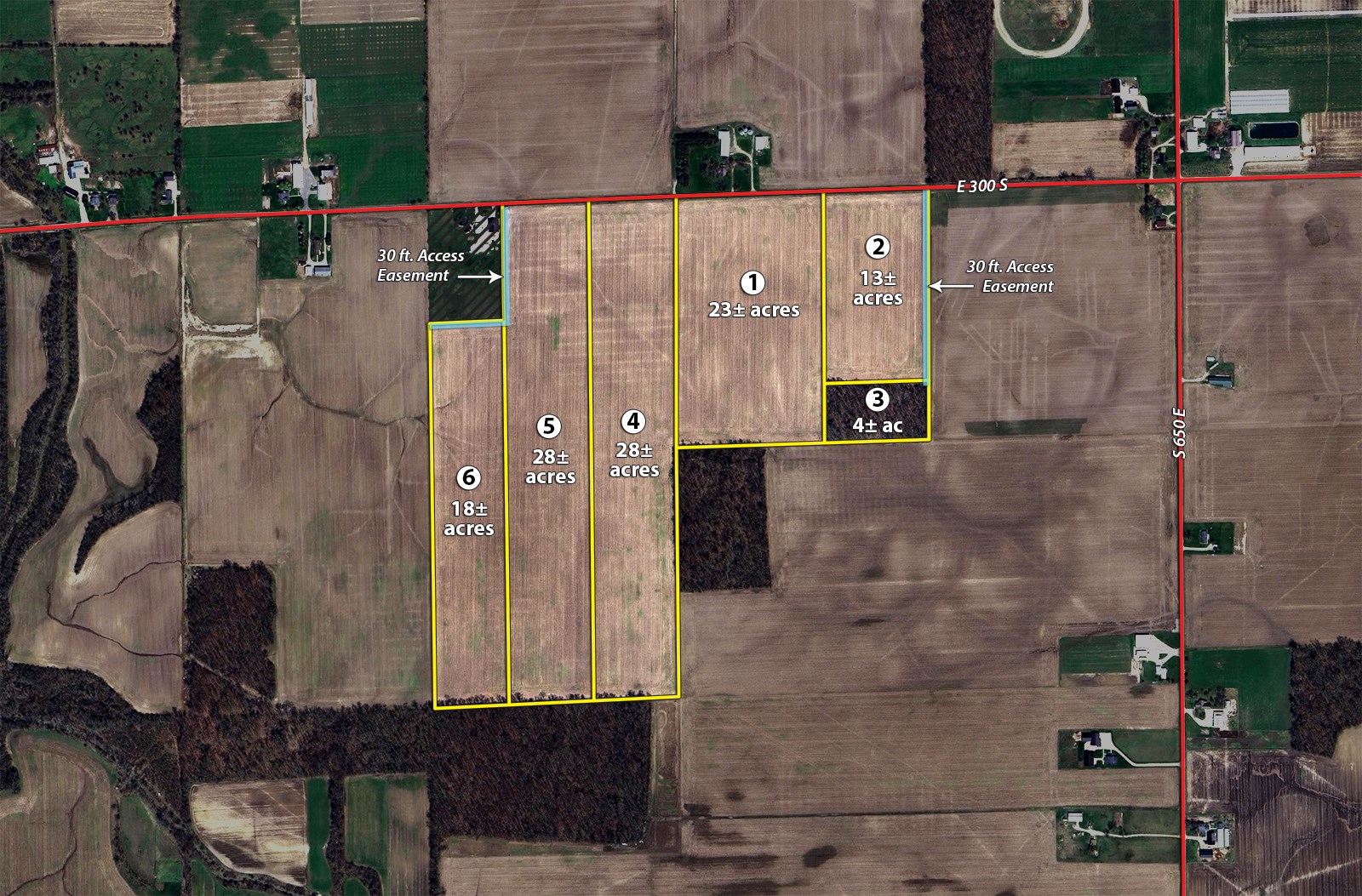 Tract 6: 18± ac mostly tillable. Access is a 30' easement from E 300 S. Soils are Pewamo and Blount.