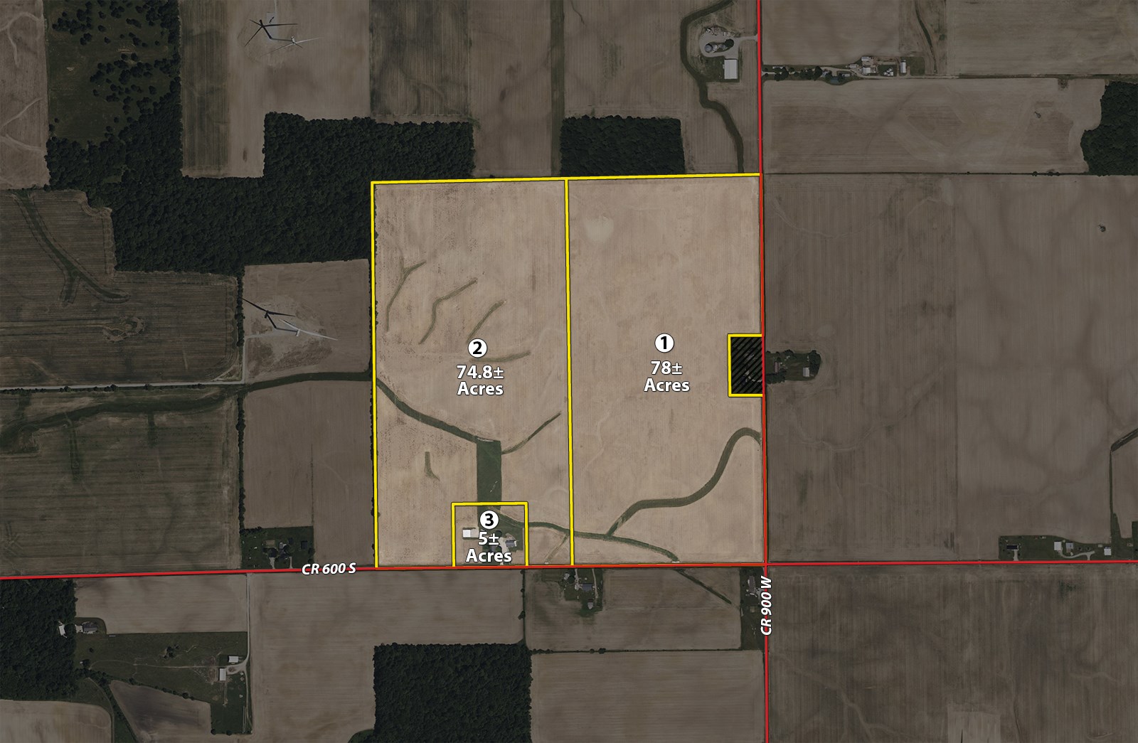 Tract 2: 74.8± ac mostly tillable with grassed waterways and a county tile running through the property. Frontage on W 600 south on both sides of Tract 3. This is a nice large field for ease of farming operation. Consider combining with Tract 1 to create a 153+/- acre field nearly all cropland. 3.5+/- acres of FSA waterways.